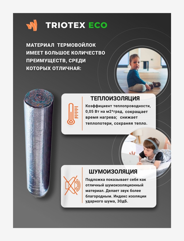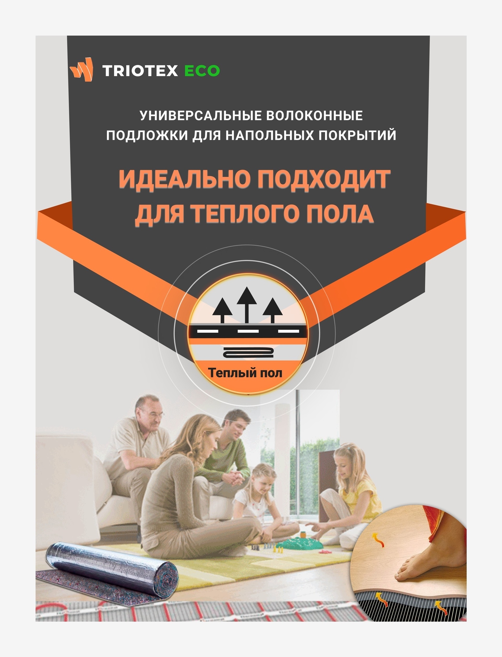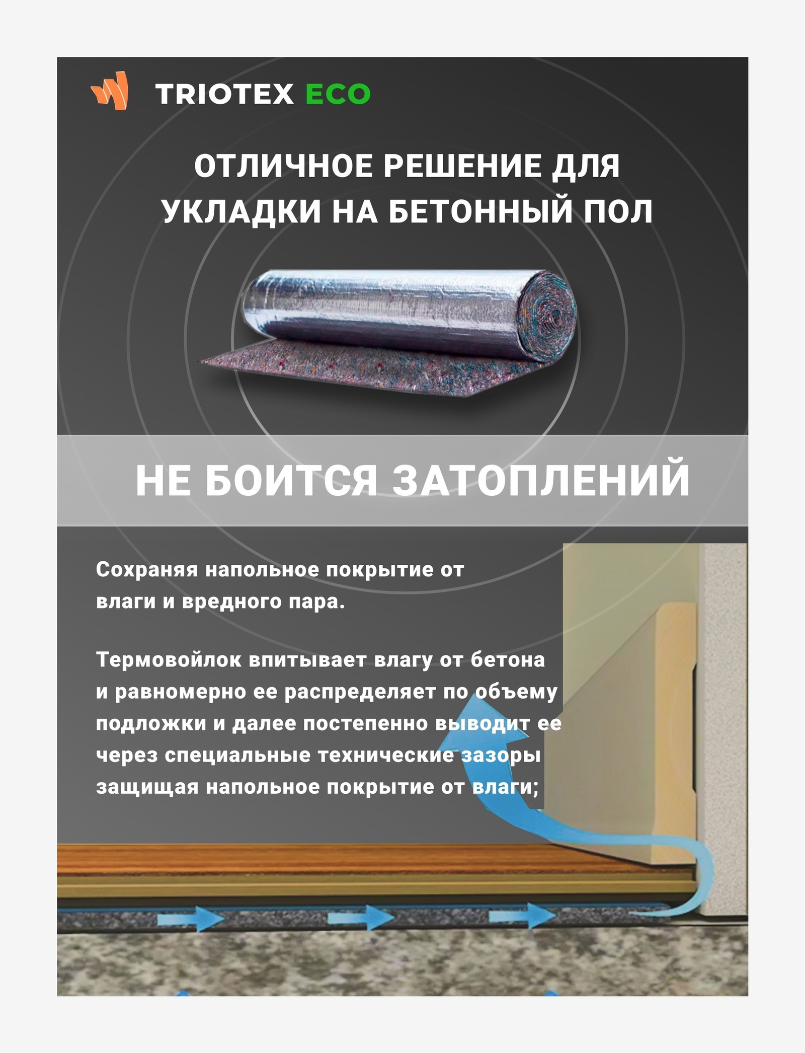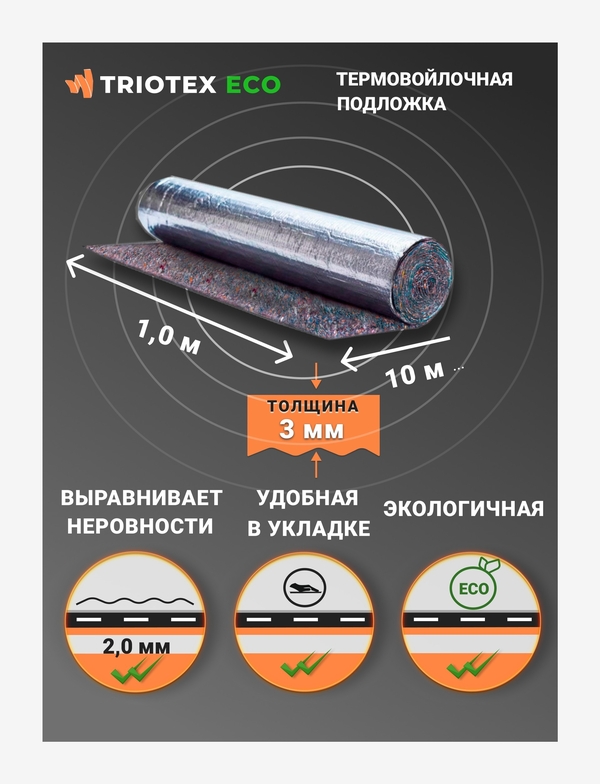 Это универсальное решение для укладки под различные напольные покрытия (как под ламинат, паркет, инженерную доску, так и под линолеум и ковролин). Термовойлок - это нетканый иглопробивной термоскрепленный материал. В состав входят натуральные волокна (80%), такие как джут, лен, хлопок, и синтетические полиэфиры волокна (20%). Термовойлок экологически чистый и гипоаллергенный материал.